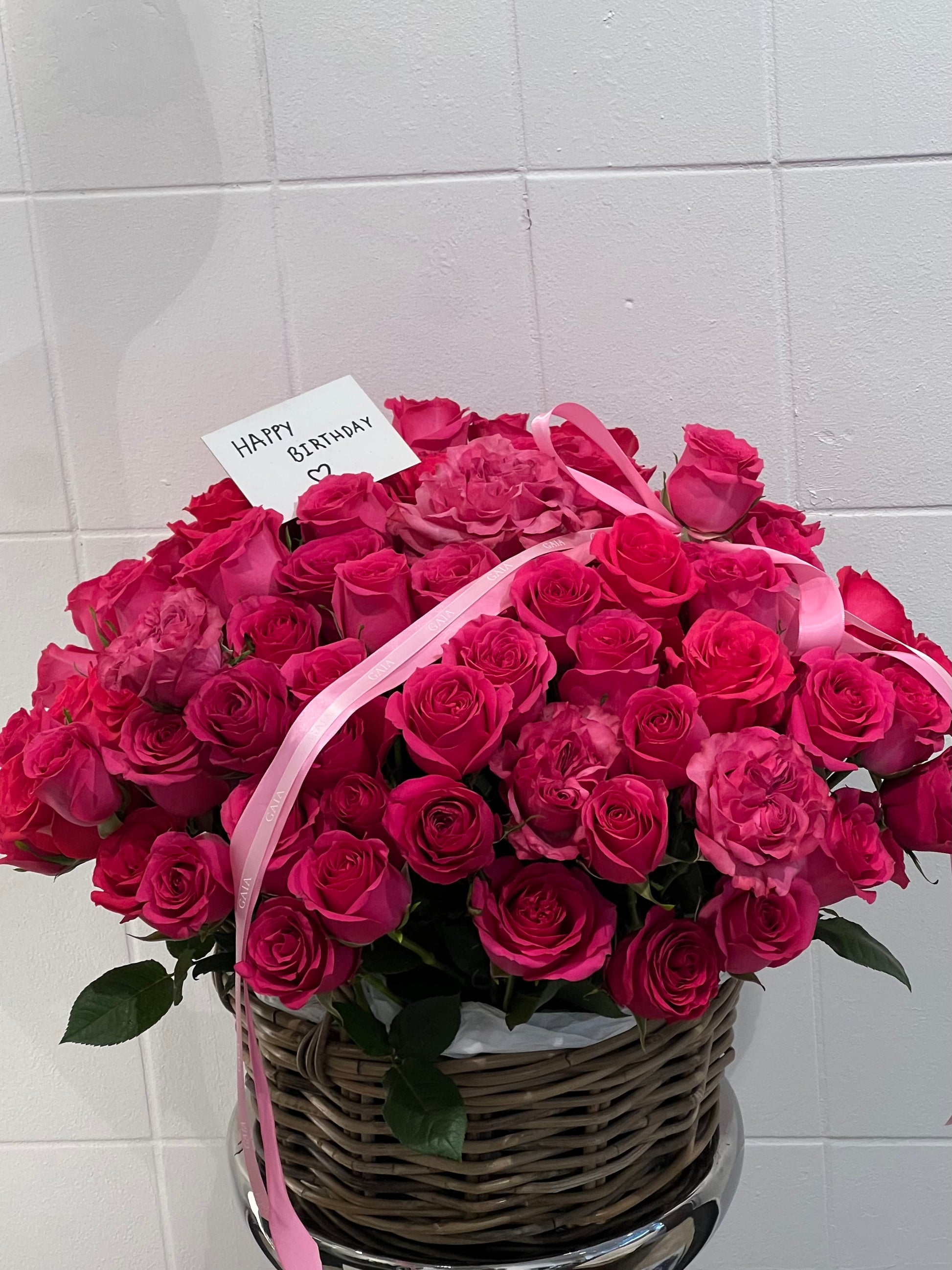 En elegant og romantisk gave. Vores smukt arrangerede kurv med friske lyserøde roser er perfekt til enhver anledning, hvor du vil vise, at du holder af.