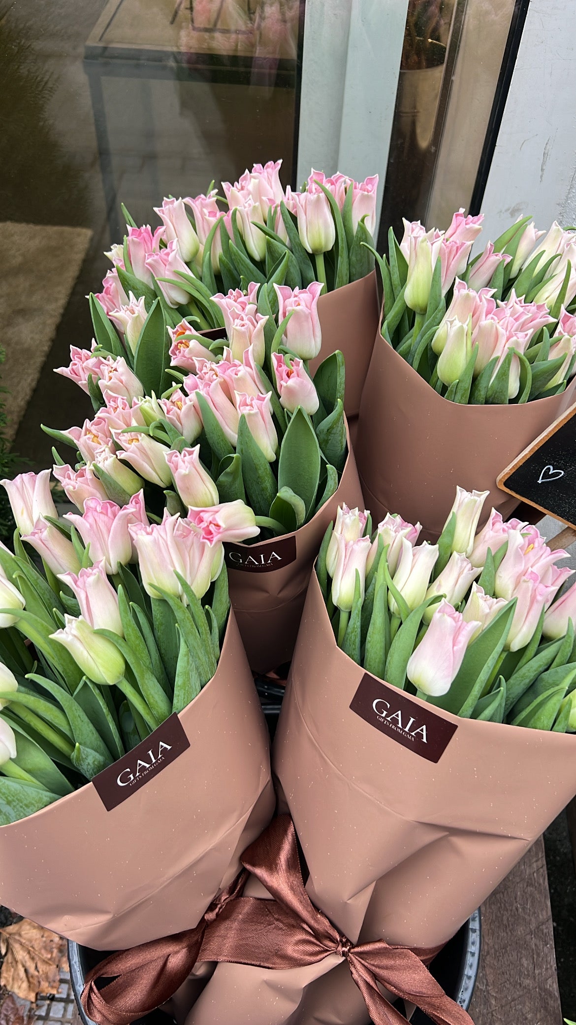 Hvide eller lyserøde tulipaner hånd bundet i smukke buketter. Farve og sort kan variere efter sæson.