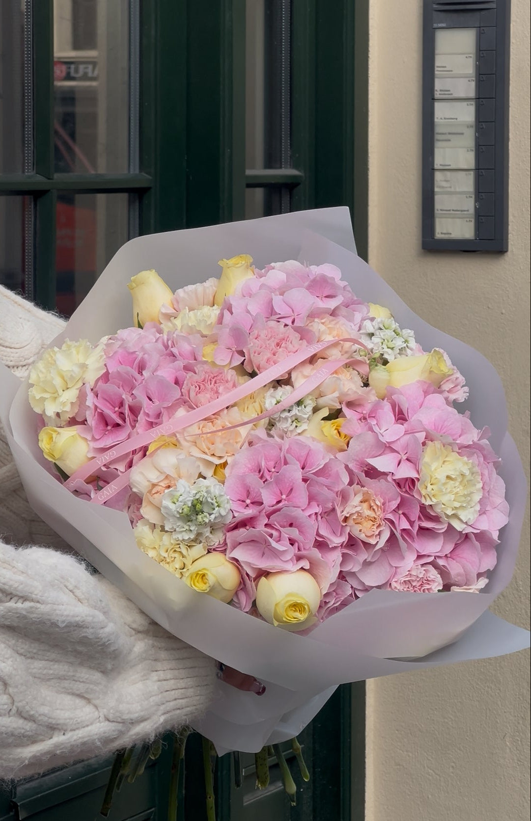GAIAS Pastel Buket er en kombination af lys blush, frisk gul og lyserøde farver. Brugen af blomster afhænger af sæsonen og derfor vil der være variationer ift. til brugen af blomster og farver.